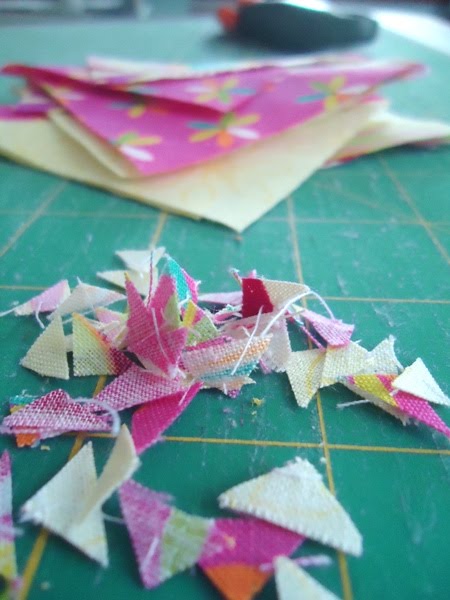 5. Press the HSTs open (without moving your iron!) and trim the little corners. You'll end up with twelve 3.5" HSTs all up.